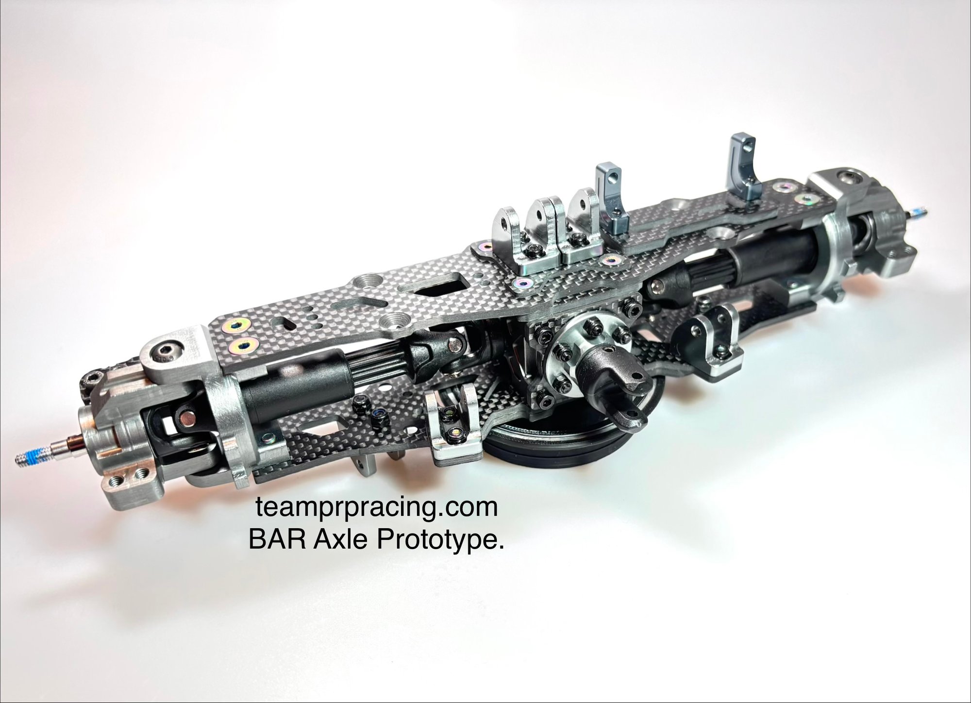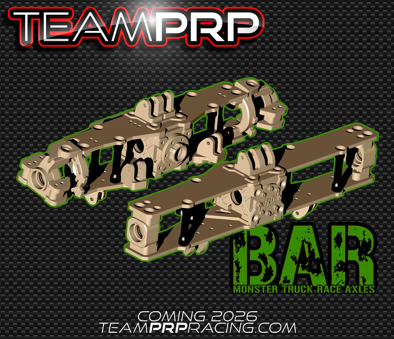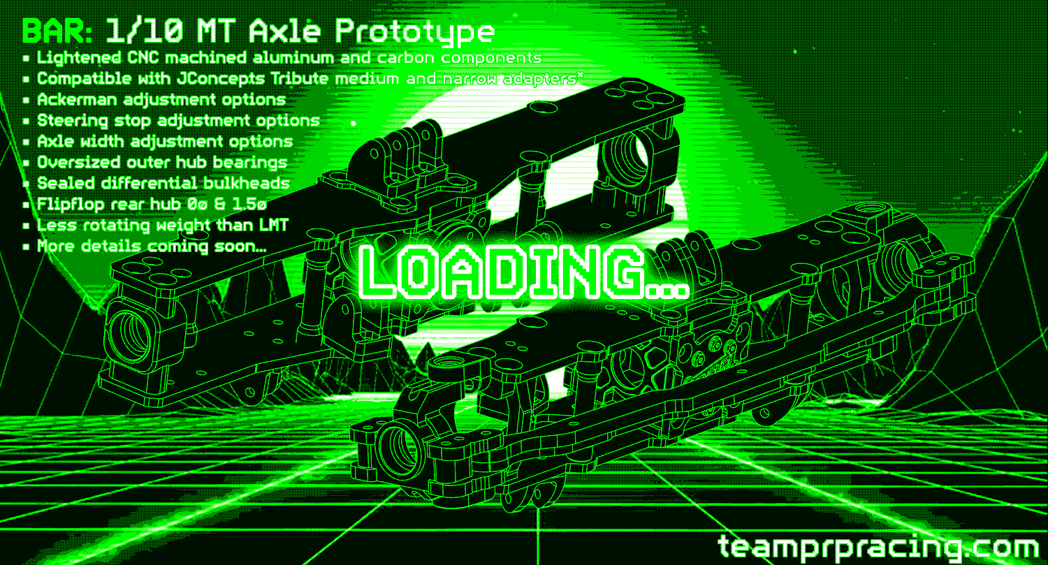 Team PRP presents the all new BAR monster truck axle set. High quality cnc machined anodized aluminum components with stiff and light carbon fiber parallel decks fixed with heavy duty m4 countersunk socket head screws. BAR axles feature sealed center differential housing, interlocking upper link mounting plates, adjustable lower link mounting positions, LCG sway bar mounting links, adjustable ackerman, adjustable steering limiters, adjustable track width*, oversized outer hub bearings, flipflop rear hubs with 0º and 1.5º toe settings, carbon steering links and the ability to run the narrow or medium JConcepts Triibute wheel adapters for less tire scrub. More info coming soon!