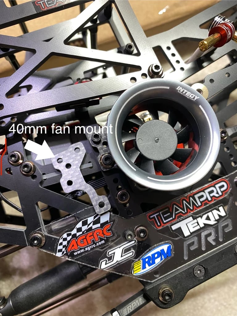 • 40mm Fan mount. Carbon fiber mount attaches to the chassis and sits over the motor endbell. Includes M3 spacers x2 and M3 screws x2. REQUIRES: 40mm Fan (32mm center to center mounting holes) and your fan mounting hardware.
