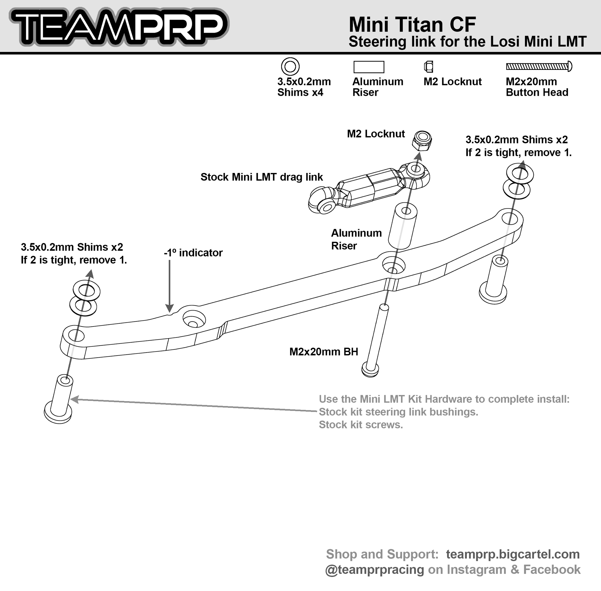 Team PRP Mini Titan CF Steering linkage for the Losi Mini LMT adds a solid and lightweight carbon fiber steering link with 1º toe out for increased racing performance. Your choice of aluminum post color in black, red, blue or gold.