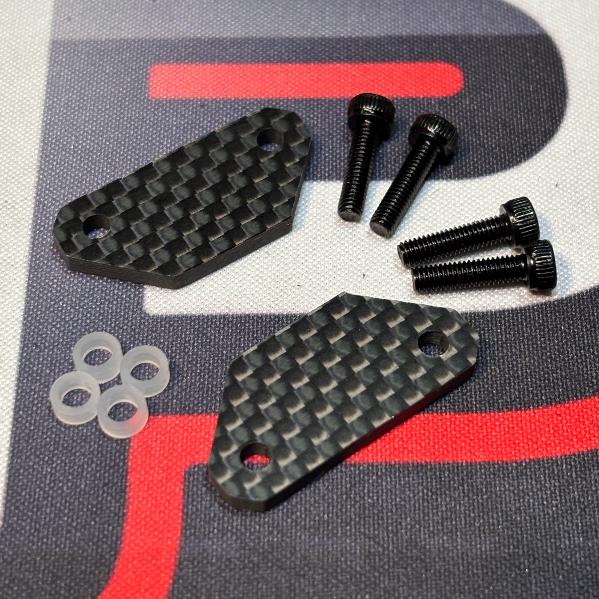 Carbon Fiber Shock On Axle Caps (SOACAPs) for Losi LMT axles are used to replace the lower shock mounts on the axles with these small, lightweight, carbon fiber covers while running a shock on link setup such as TLR Tuned trailing arms or our Team PRP trailing arms. Cleans up the look of the axles and adds bracing strength. Sold as 1 pair , with mounting hardware to complete 1 axle. You will need 2 sets for a complete truck with 2 axles or use our Type-B Rear Axle Weight on the rear axle with 1 set of SOACAPs up front.
